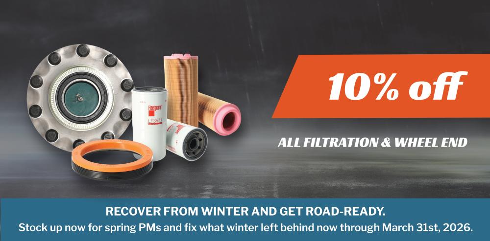 Harsh conditions can damage filters and wheel ends - stock up now for spring PMs and fix what winter left behind. Save 10% now through March 31st, 2026.